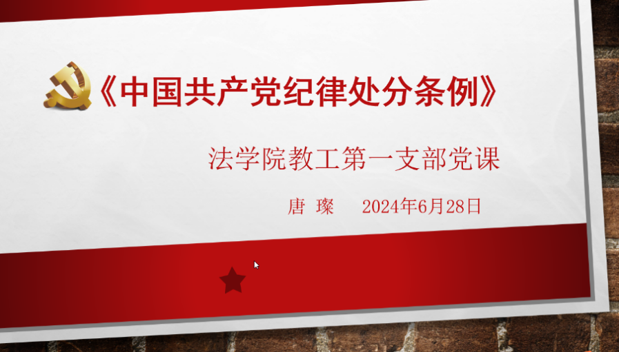 6月28日,bet365官网 教工一支部围绕新修订的《中国共产党纪律处分条例》举行支部书记讲党课活动。支部书记唐璨老师围绕《中国共产党纪律处分条例》制定、修改基本情况以及结合专业谈学习体会两方面与支部同志交流对党纪的理解与运用。尤其是在纪律处分工作基本原则、纪律处分运用规则等方面,结合法律制度和具体规则讲授分析了党纪处分与政务处分以及其他法律责任的关系等问题。