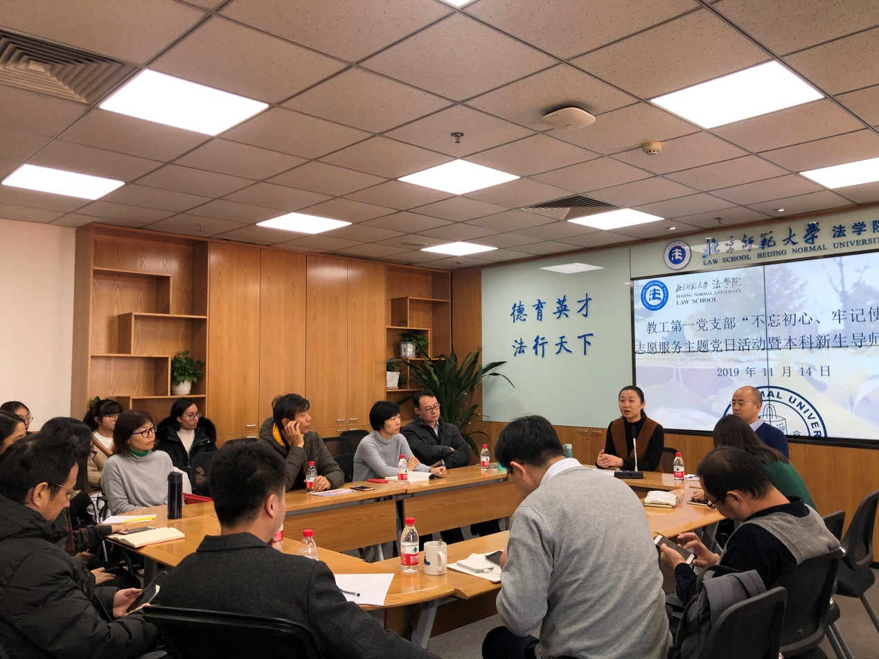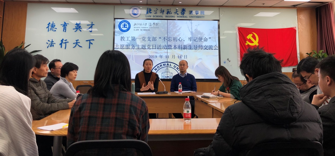 2019年11月14日中午,bet365官网 教工第一党支部“不忘初心、牢记使命”志愿服务主题党日活动暨本科新生导师交流会在后主楼1922会议室顺利举行。教工第一党支部的教工党员和来自2019级瀚德实验班、卓越实验班的近20名本科新生共同参加了本次交流会,会议由支部书记唐璨老师主持。
