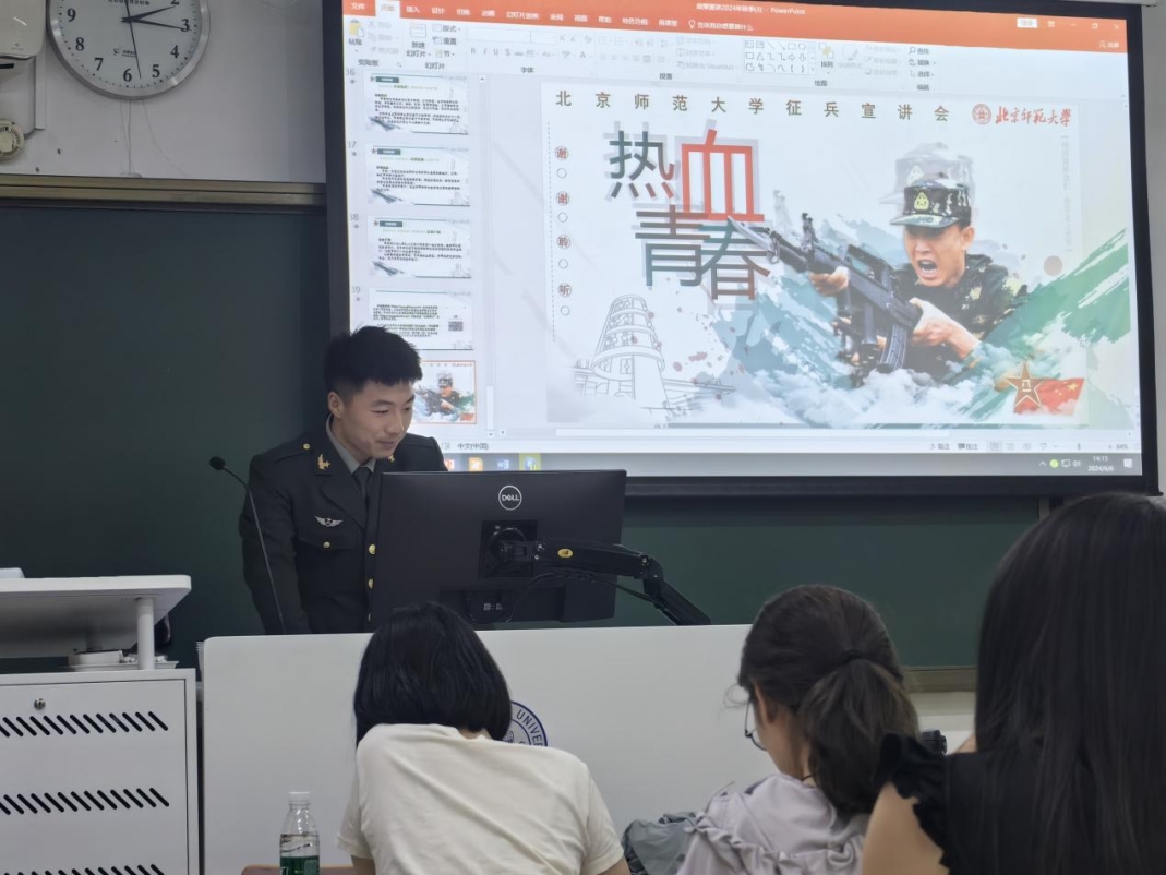6月6日下午,bet365官网 在教二109开展研究生征兵宣讲会,北京师范大学体育与运动bet365官网 退役复学士兵武宇飞为宣讲会主讲人。会上,武宇飞详细解读了当前应征入伍政策,从政策背景、入伍条件、选拔流程、待遇保障等方面进行深入介绍,结合自身经历动员适龄青年积极响应国家号召投身国防建设。