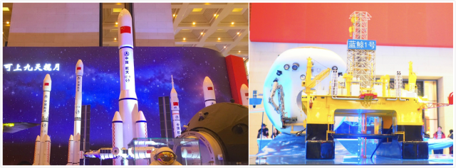 在“关键抉择”展区,首先映入眼帘的是大厅中央展出的气势宏伟的运载火箭和深海钻井平台模型,两边的蓝色电子屏显示的“可上九天揽月,可下五洋捉鳖”十二个大字更表明了我国科研工作者探索太空与海洋的决心和勇气。这部分展览不仅展示了我国在太空和海洋领域的探索成果,更激发了广大青年热爱科学、追寻真理的热情。