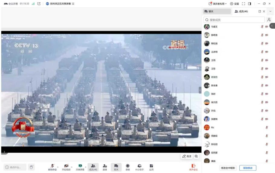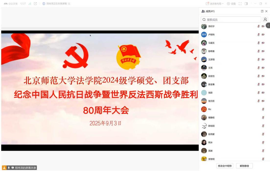 2024法学硕士党支部的房靖凯表示,观看抗战胜利80周年阅兵,目睹国产现役主战装备的集中亮相和官兵昂扬姿态,深感国家强大与和平来之不易。作为新时代中国青年,我们更应铭记先烈视死如归、宁死不屈的民族气节,弘扬天下兴亡、匹夫有责的爱国情怀,紧密围绕在以习近平同志为核心的党中央周围,将科研学习与民族复兴使命紧密结合,以专业能力贡献国家发展,告慰历史,开创未来。