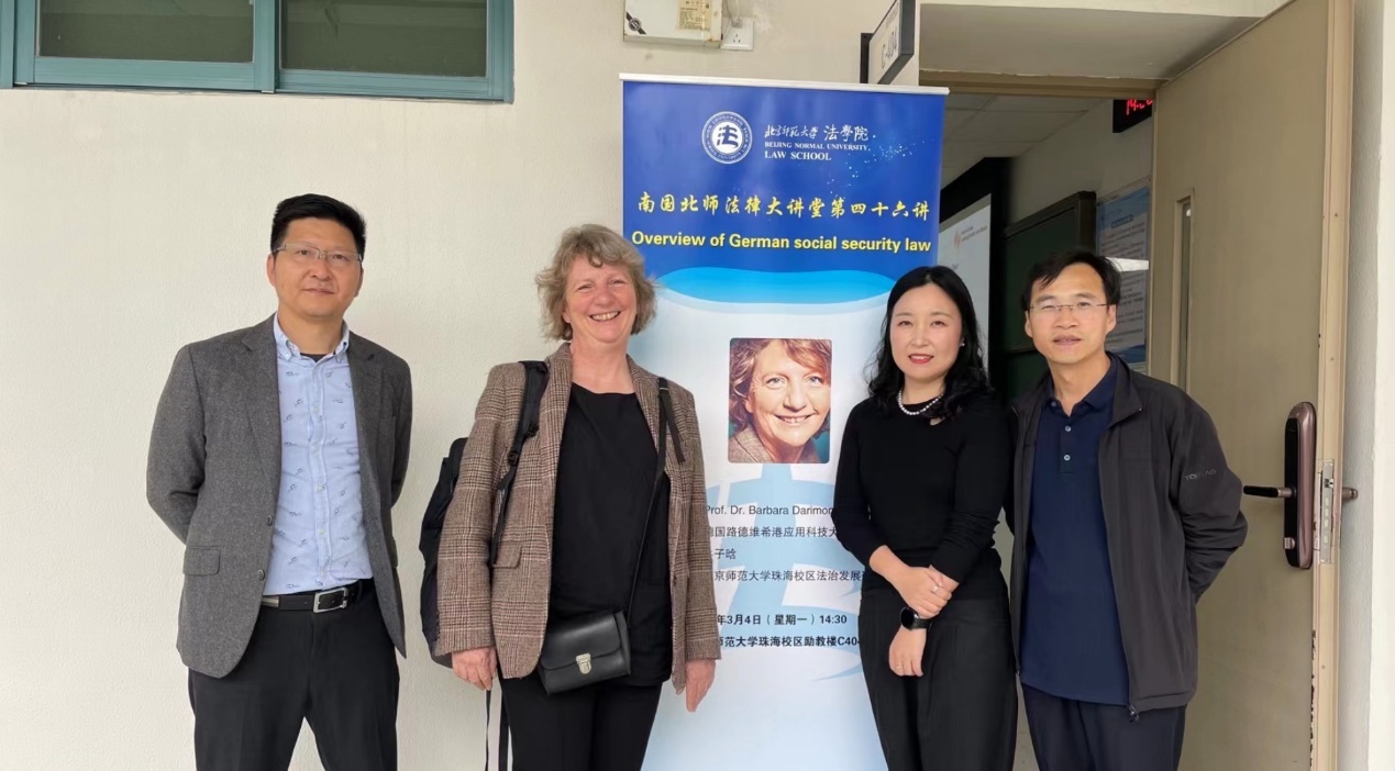 On March 4th, the 46th lecture of the BNU Zhuhai Legal Lecture Series, titled "Overview of German Social Security Law," was successfully held at Room C404, Lijiao Building, Beijing Normal University at Zhuhai. This lecture was given by Professor Barbara Darimont from Ludwigshafen University of Applied Sciences in Germany and hosted by Mr. Niu Zihan from the Center on the Rule of Law and Development at Beijing Normal University. Professor Yuan Zhijie, Vice Dean of the Law School and Director of the Rule of Law Development Research Center at the Beijing Normal University at Zhuhai, and Dr. Ye Zaixing from Zhuhai Huafa Group served as panelists. The session was attended and closely studied by a group of engaged master’s and PhD students from Beijing Normal University at Zhuhai.