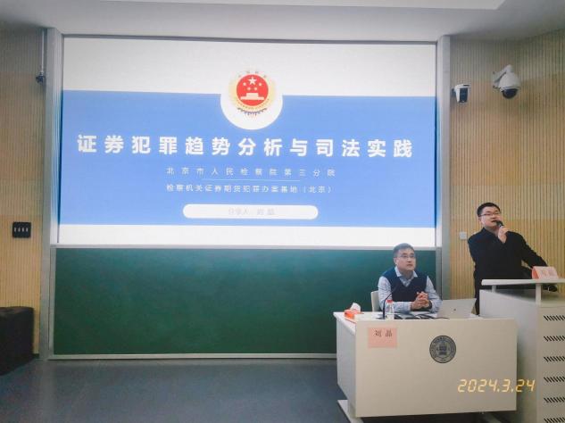 In the lecture section, Prosecutor Liu Jing first introduced the development status of China's securities and futures market to the students from the aspects of securities market structure, capital market formation, information disclosure system, and registration system reform. He also explained the overall situation and criminal regulation of securities and futures crimes in China from the perspectives of common types of securities crimes in judicial practice, execution chain mechanism, the function of procuratorial organs in managing securities and futures crime cases, and trend analysis of crime development. Next, Prosecutor Liu Jing elaborated on the main judicial practice issues in securities crimes, taking the crimes of insider trading, leaking insider information, trading with undisclosed information, and fraudulent issuance of securities as examples, from the perspective of explaining the constituent elements and analyzing the standards for handling cases. Regarding the controversial issues commonly encountered in judicial practice such as "abnormal transaction determination", "passive knowledge determination", and "degree of proof of contact", Prosecutor Liu Jing used typical cases publicly released through channels such as criminal trial references and joint publications by the China Securities Regulatory Commission, the Supreme People's Court, the Supreme People's Procuratorate, and the Ministry of Finance to provide a detailed interpretation of the main points of the judgment from the perspective of criminal law theory and practice determination, clarifying the practices and legal basis of the procuratorial organs in handling controversial issues.