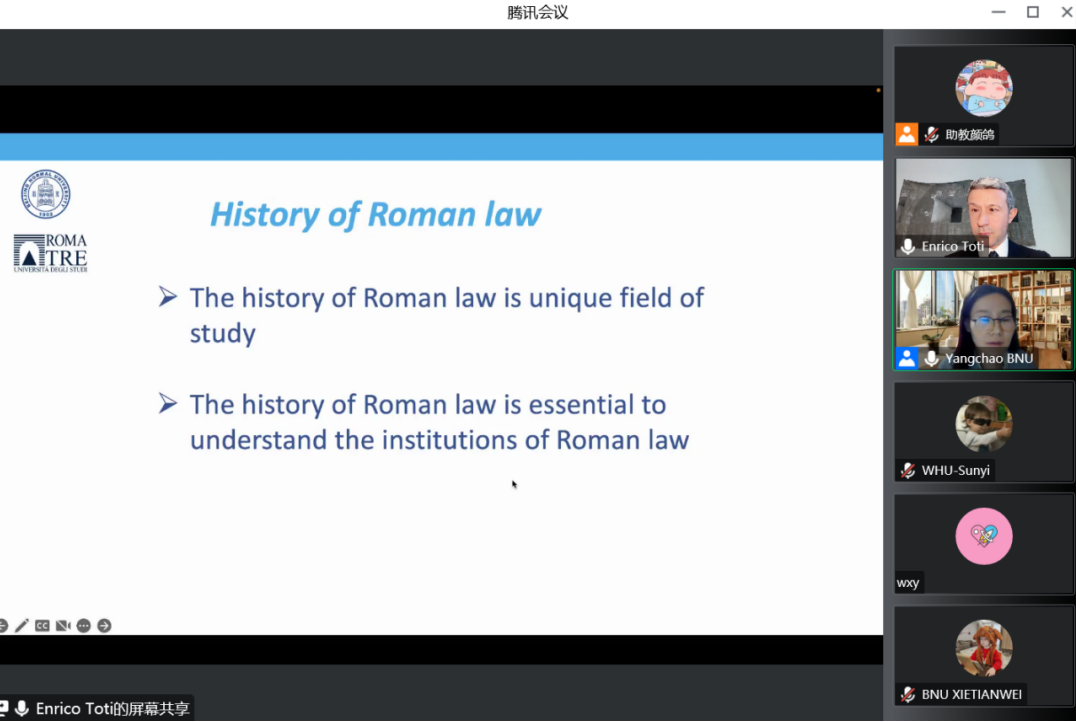 In the series of courses, Professor Enrico Toti discussed the origin and development of Roman law under the themes of "The Relevance of Roman Law" and "Roman Law and Contemporary Law", and explained how Roman law integrates into the modern European legal system from the dimensions of time and space. He also comprehensively and accurately expounded the close relationship between Roman law and Chinese civil law in conjunction with the promulgation of the Civil Code of the People's Republic of China.