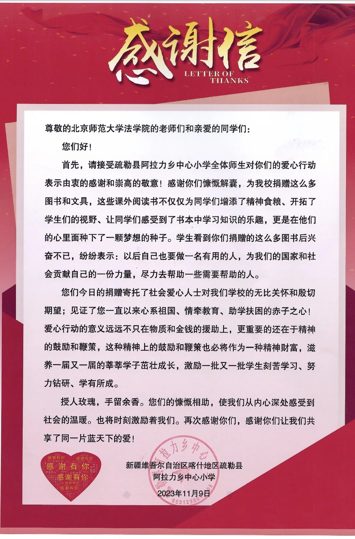 自2022年“助力南疆 法育未来”爱心助学物资捐赠活动后,bet365(亚洲)官方网站 再次举办2023年“捐书留香 再会南疆”向新疆喀什地区疏勒县阿拉力乡小学捐赠活动。近期,这些来自首都北京的物资满载着温暖和关心、祝福和寄望抵达目的地,为孩子们的秋冬学期带来了浓浓的暖意。