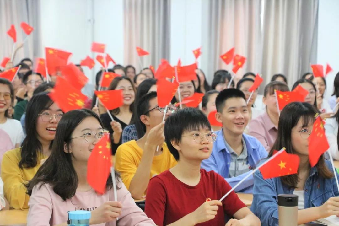 直播开始前,同学们佩戴团徽、手持国旗依次入场就坐,期待着阅兵仪式直播的开始。十点整,当李克强总理宣布庆祝祖国成立70周年大会的开始,这激动人心的时刻终于到来,同学们不禁欢呼雀跃,教室里掌声雷动。
