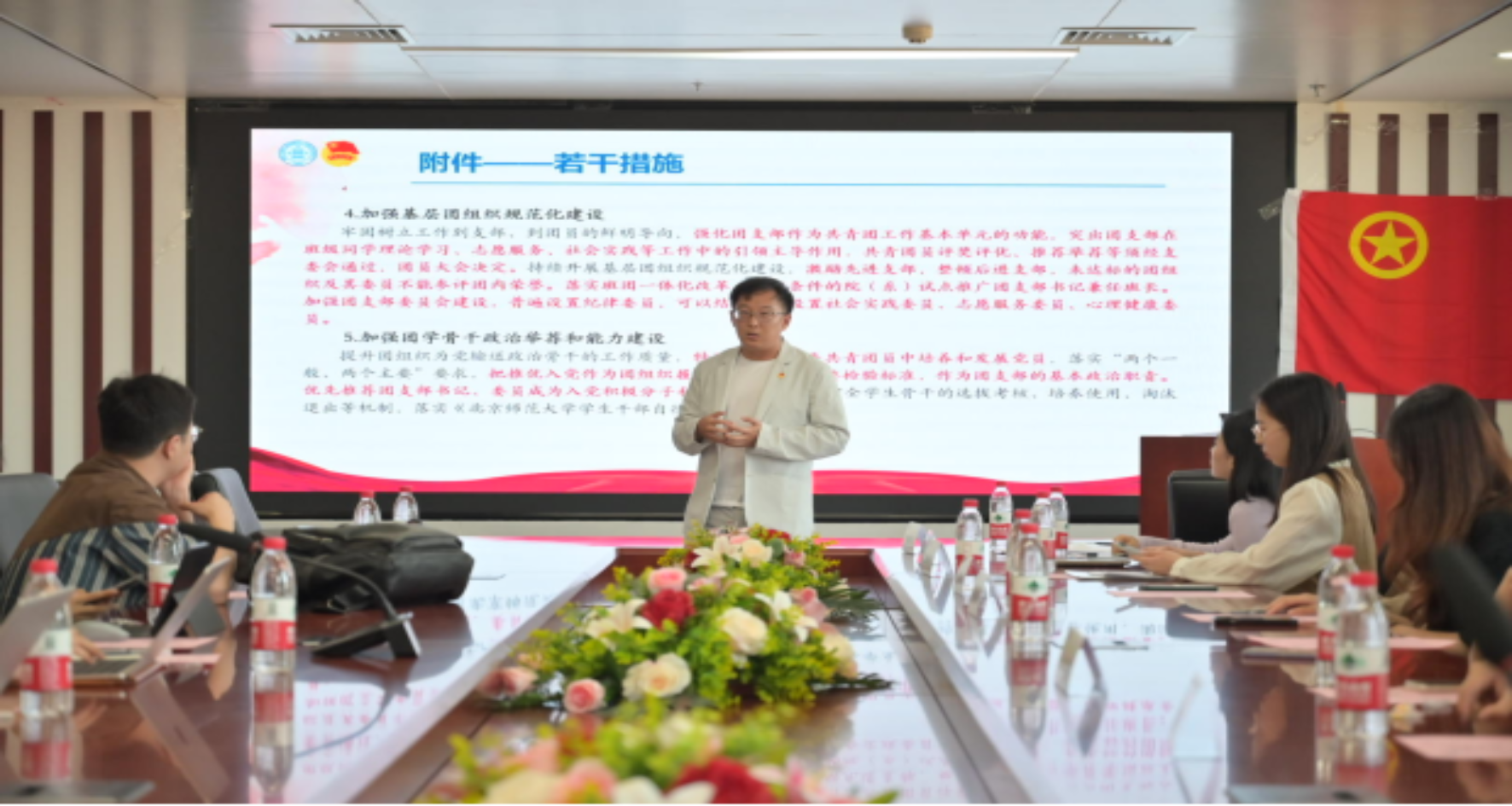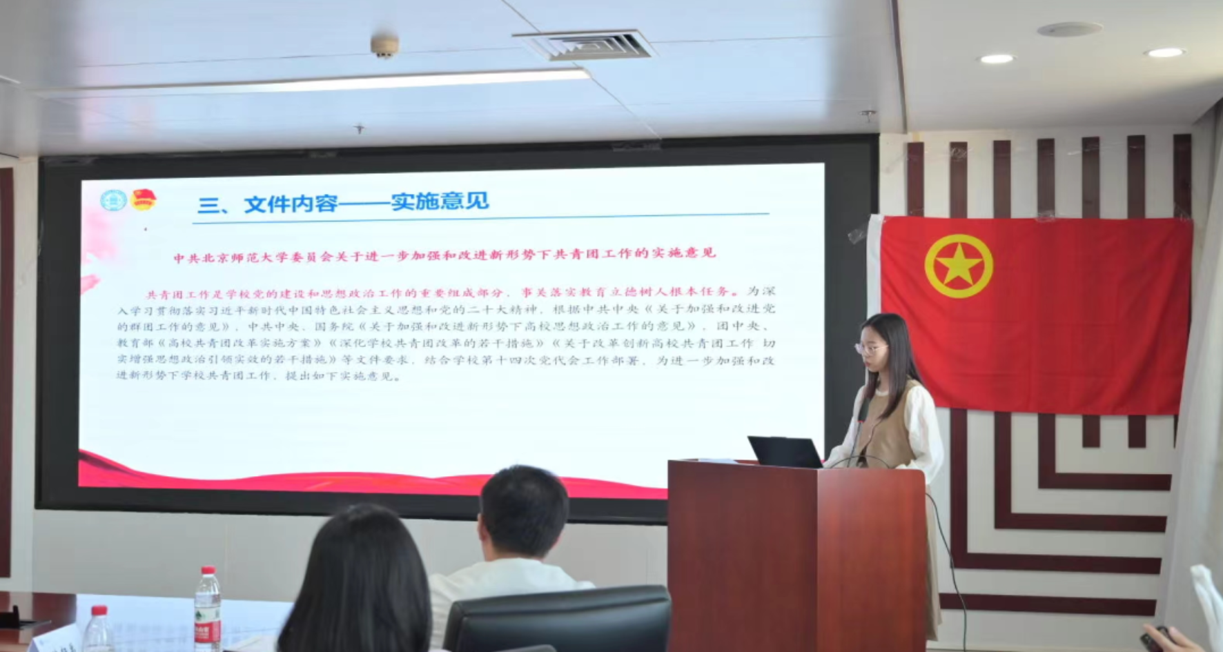 随后,强诗妍带领大家学习了关于《中共北京师范大学委员会关于进一步加强和改进新形势下共青团工作的实施意见》。陈轩禹强调,新版《实施意见》要求我们深刻认识到,共青团工作是学校党的建设和思想政治工作的重要组成部分,事关落实教育立德树人根本任务。