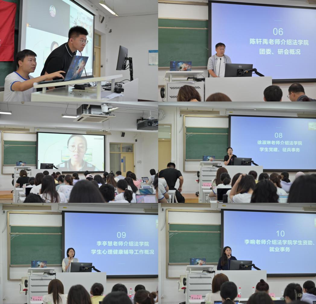 陈轩禹老师、艾惠子老师、徐淑琳老师、李亭慧老师和李响老师分别围绕学院团委、研究生会工作、法律硕士日常事务管理、bet365官网 学生党建、征兵事务、学生心理健康辅导工作及学生资助和就业事务等方面为同学们进行了梳理和介绍。