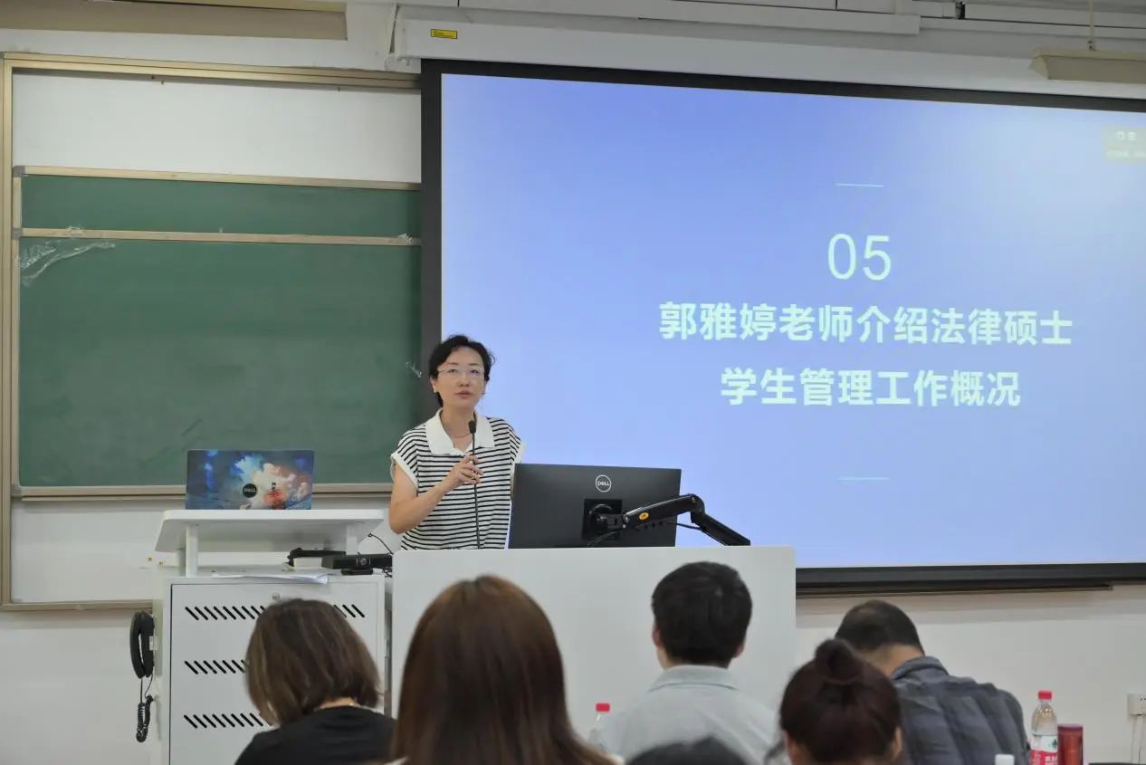 郭雅婷老师从学生管理工作角度出发,提醒法律硕士新生在今后的学习及生活中遵守学校各类规章制度,谨防电信诈骗,勉励学生注重学业与参与各类社会实践活动间的平衡,关注自身心理健康,不断提高综合素质,鼓励新生们加强与班主任、辅导员老师的及时沟通。