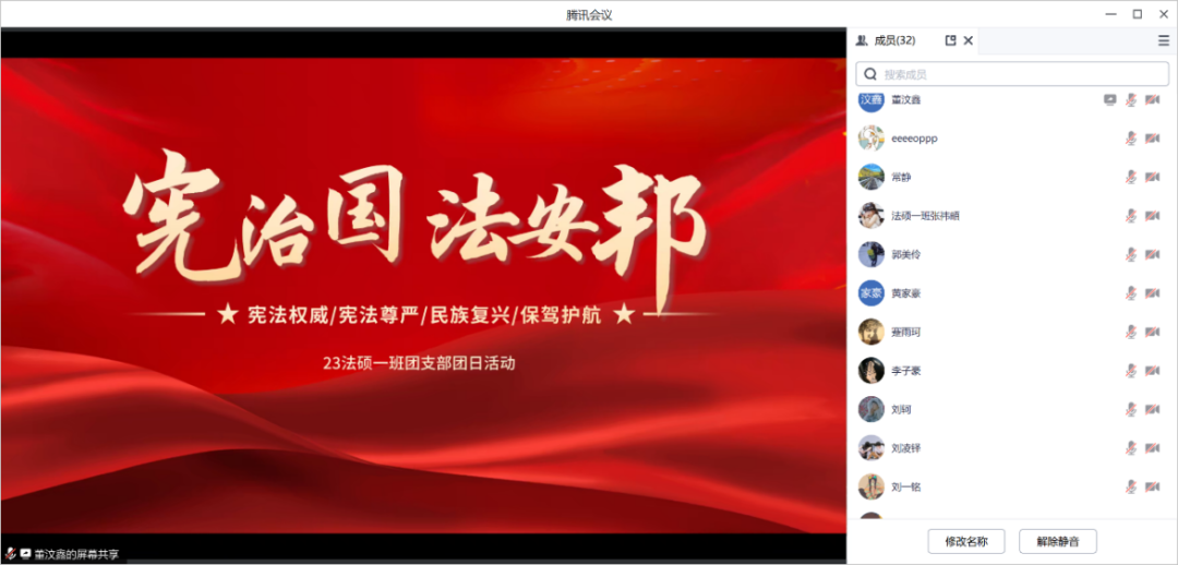 12月6日晚,2023级法硕2班团支部组织召开了“学习习近平法治思想,推进宪法理论和宪法实践创新”的宪法主题团日活动。本次会议采用线上形式,由团支书梅笑宇主持,内容包括宪法日介绍、习近平法治思想学习以及团员主题讨论三个环节。在主题团日中,同学们深刻理解了习近平总书记作为全党和党中央的核心,高瞻远瞩、审时度势,根据新时代中国特色社会主义法治建设的新特点,就全面依法治国提出了一系列新理念新思想新战略,最终形成了习近平法治思想。这一重要思想包含的一系列关于宪法的重要论述,构成了一整套科学完备的宪法理论体系,标志着我们党对宪法的认识和实践达到了一个新的高度。
