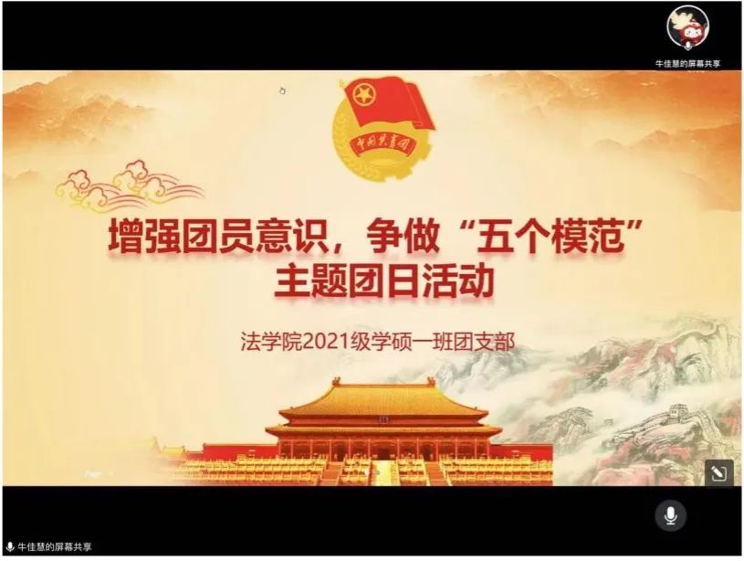 5月13日晚,bet365官网 2021级学硕一班线上召开了以“增强团员意识,争做‘五个模范’”为主题的团日活动。本次活动由团支书牛佳慧同学主持。活动由五项内容组成,分别是政治生日会、理论学习会、线上观展、主题团课以及实践活动分享。全体参会团员一齐合唱团歌,重温入团誓词,参会同学交流分享了各自的入团初心及入团以来的心得感受。全体同学共同对团章进行了回顾,并学习了习近平总书记在庆祝中国共产主义青年团成立100周年大会上的讲话。随后,同学们一同进入了线上展厅,参观了北京师范大学青年运动主题展,一同感受了变革图强、育人兴邦梦想的一代代北师大先进青年留下的青春业绩。在第四个环节——以回顾党的青年运动史为主题的团课上,参会同学们分享了自己观展的心得感受。