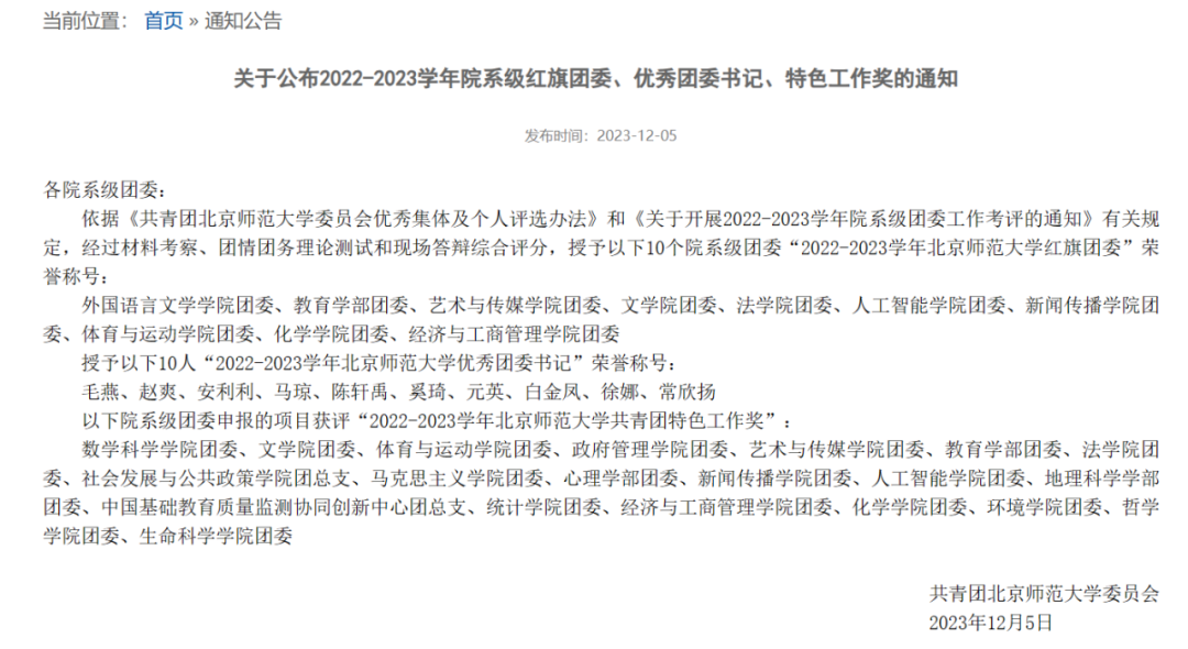 2023年12月5日,依据《共青团北京师范大学委员会优秀集体及个人评选办法》和《关于开展2022-2023学年院系级团委工作考评的通知》有关规定,经过材料考察、团情团务理论测试和现场答辩综合评分,bet365官网 团委获得“2022-2023学年北京师范大学红旗团委”荣誉称号和“2022-2023学年北京师范大学共青团特色工作奖”,bet365官网 团委书记陈轩禹老师获得“2022-2023学年北京师范大学优秀团委书记”荣誉称号!