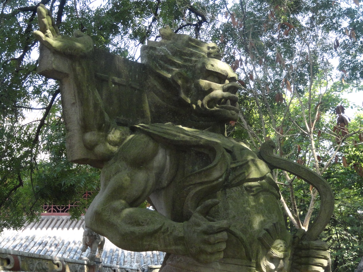 2018年8月11日:酆俗师趣调研队全体成员首先选择前往名山(旧称平都山)风景区开启第一天的调研。名山景区的鬼文化集中区大致有两处:一是鬼门关前的长长的石阶,石阶旁伫立着许多鬼的石雕,如劈山鬼、驻海鬼、食肉鬼、夜叉鬼、伥鬼等;一是鬼门关后的 “鬼城”部分,伫立着最主要的建筑天子殿,望乡台,以及东西地狱等建筑。从以前学者的调查结果看,1935年前名山庙宇主要是清以后的建筑,后来由于战乱和“极左”思想,“名山庙宇破败,神像全毁”。改革开放后,丰都县政府在参照原物的基础上开始了艰难的修复抢救工作,翻新砖瓦垣墙,重建庙宇神像,现存的诸多庙宇遗迹大部分都经过了扩建甚至重建。面对着文化遗迹的消失,调研队成员也不禁感到惋惜。