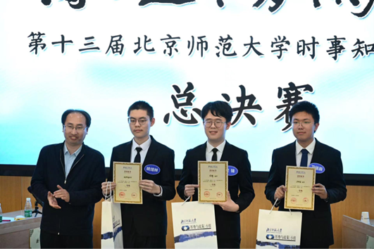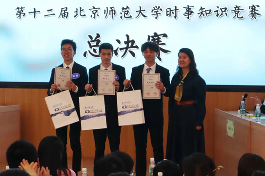 4月2日晚,第十二届“博古通今 胸怀天下”北京师范大学时事知识竞赛总决赛在教九楼502教室成功举办。本届比赛共有来自16个学部院系的24支代表队,72名选手报名参加。经过初赛选拔,历史bet365官网 、bet365官网 、外国语言文学bet365官网 、新闻传播bet365官网 4支代表队进入总决赛。我院胡俊杰(2020级卓越实验班),魏未(2020级卓越实验班),郑翰(2021级卓越实验班)组成的bet365官网 代表队思维敏捷、表现优异,尽管最终惜败新闻传播bet365官网 获得亚军,仍然向现场观众展现了bet365官网 学子团结一致、踔厉奋发的精神风貌。胡俊杰同学获得本届大赛“最佳风采奖”,bet365官网 获得“最佳组织奖”。