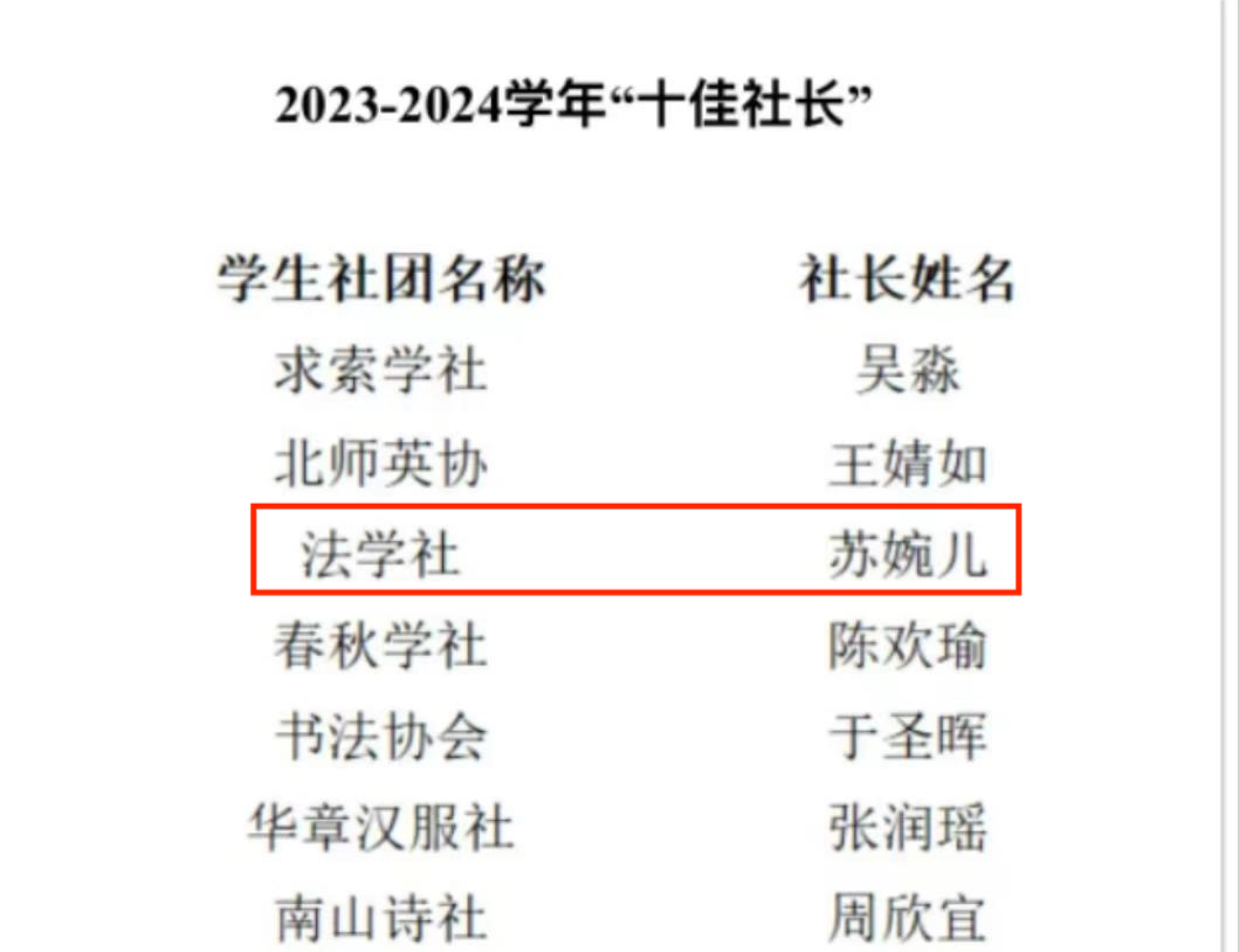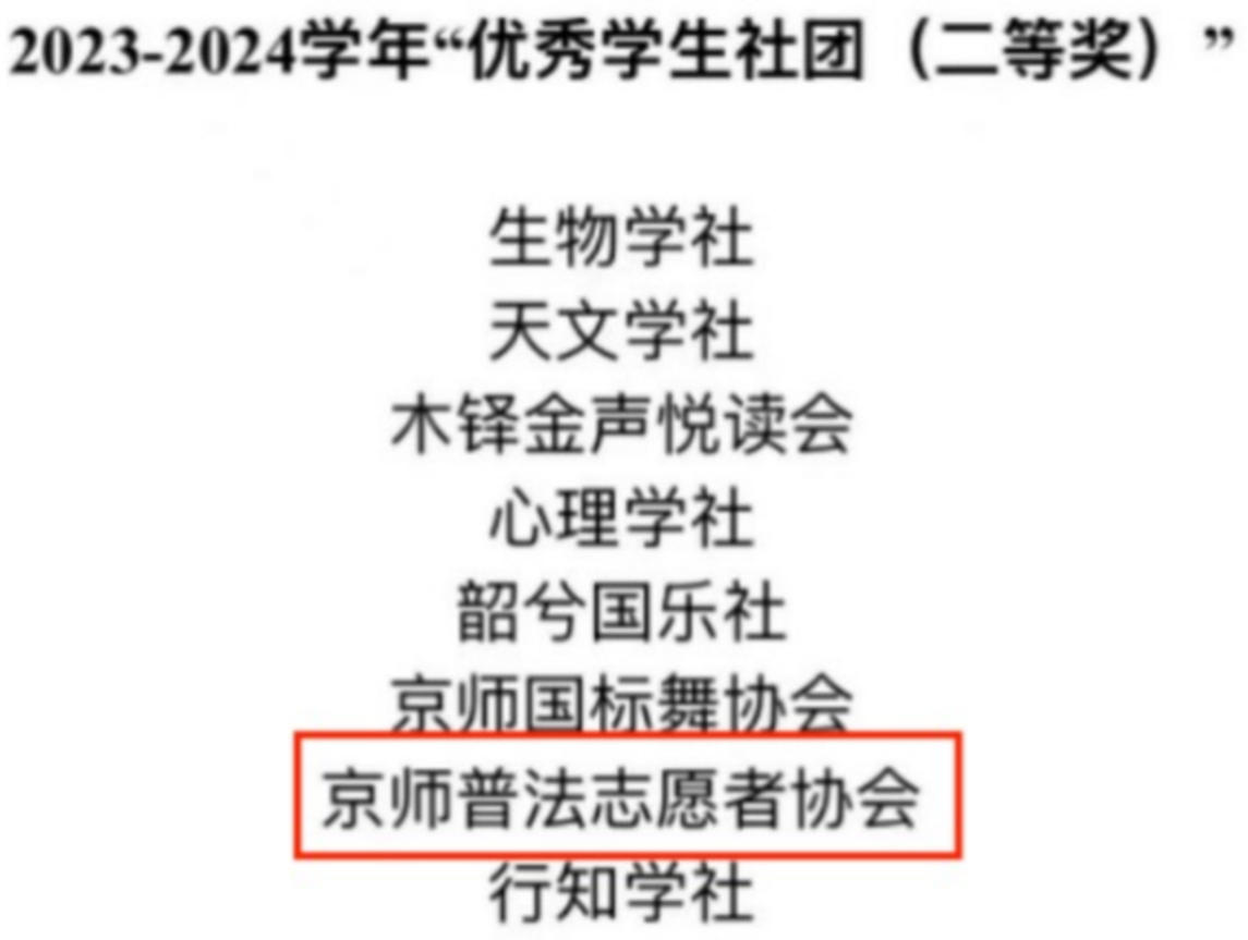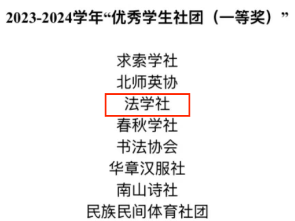 根据《北京师范大学学生社团建设管理办法》、《北京师范大学学生社团年审考核暨“优秀学生社团”评选办法》,遵循公正、公平、公开原则,通过基础材料评审和现场答辩,我院共有两个社团——北京师范大学法学社与京师普法志愿者协会从200多个社团中脱颖而出,分别荣获2023-2024年度“优秀学生社团(一等奖)”、“优秀学生社团(二等奖)”,同时法学社社长苏婉儿荣获2023-2024学年“十佳社长”称号。其中,北京师范大学法学社连续22年获得“双十佳”称号。