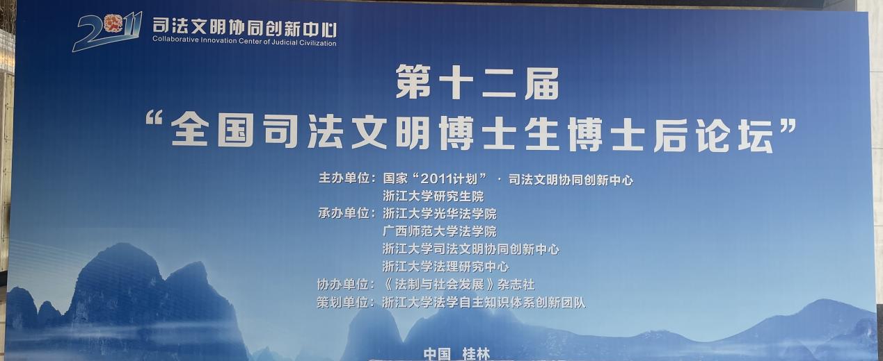 2024年11月18日至19日,第十二届“全国司法文明博士生、博士后论坛”在广西桂林召开。该论坛是国家“2011计划”司法文明协同创新中心的年度活动之一,由理事长兼联席主任张文显教授发起,至今已经走过十二个年头。第十二届论坛由国家“2011计划”司法文明协同创新中心、浙江大学研究生院主办,浙江大学光华bet365官网 、广西师范大学bet365官网 、浙江大学司法文明协同创新中心、浙江大学法理研究中心承办,《法制与社会发展》杂志社协办,浙江大学法学自主知识体系创新团队策划,论坛主题为“中国式现代化的司法保障”。分主题为“刑事证据”、“《刑事诉讼法》第四次修改”、“人工智能司法”、“法律文化”、“人权法学”、“司法制度”和“环境司法”,共计七个单元展开研讨。组委会遴选出41篇入围作品,邀请了来自北京大学、清华大学、中国人民大学、中国政法大学、北京师范大学等高校共计六十余名博士生、博士后和二十余位专家学者参加、出席本次论坛。bet365官网 博士生刘子良受邀参会并作出主题发言。