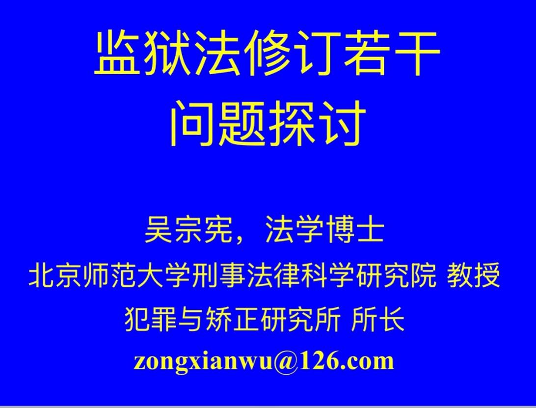 吴宗宪教授的讲座内容就是以上述研究、考察以及思考等为基础的。讲座内容包括三部分。第一部分是监狱法修订的理念问题,他阐述了应维持平均生活水平理念,不因犯罪而额外获益理念,兼顾监管与改造理念,监狱分类和罪犯分级相结合理念,监狱工作社会化理念,立足国内兼顾国际的理念,兼顾当前需要与未来发展理念。他希望,这些理念的内容能够对做好监狱工作和修订监狱法有一定参考价值。第二部分是监狱法修订的内容问题,他从准确理解监禁刑的惩罚性、增加刑事司法机关之间定期交流信息制度、增加有关外籍犯管理的内容、增加监狱开展预防犯罪工作的内容、规定监狱工作者分类制度、增加鼓励专家型干警在基层工作、规定促进监狱工作者身心健康、增设母婴监区、进一步增强刑事司法机关之间的相互制约、规定保障罪犯户外活动时间、增加有关被赦免人员的相关规定、增加有关通信和会见内容的相关规定等方面,发表了他自己的思考和看法,提出了相关的立法建议。第三部分是监狱法修订的表述问题,对《中华人民共和国监狱法(修订草案)》新增加的多个条文的文字表述,提出了改进建议。