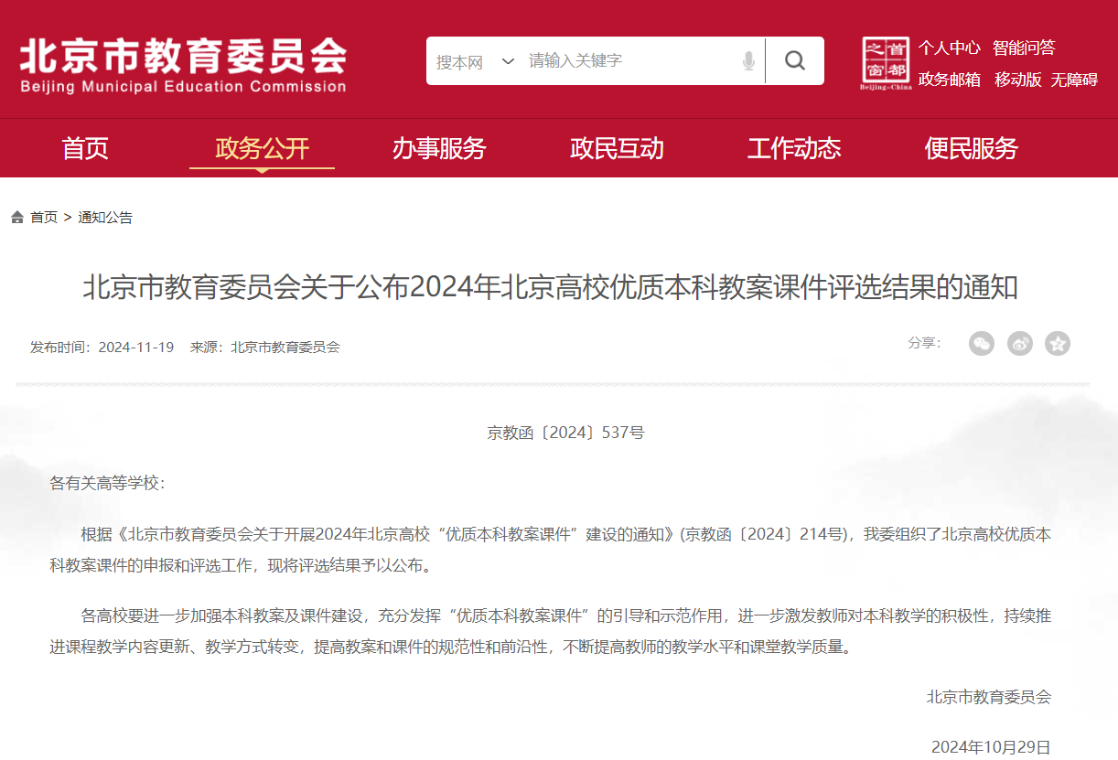 近日,北京市教育委员会发布了《关于公布2024年优质本科教材遴选结果的通知》(京教函〔2024〕536号)和《关于公布2024年优质本科教案课件评选结果的通知》(京教函〔2024〕537号)。我院1部教材获评“2024年北京高校优质本科教材”、1门课程课件获评“2024年北京高校优质本科课件”。