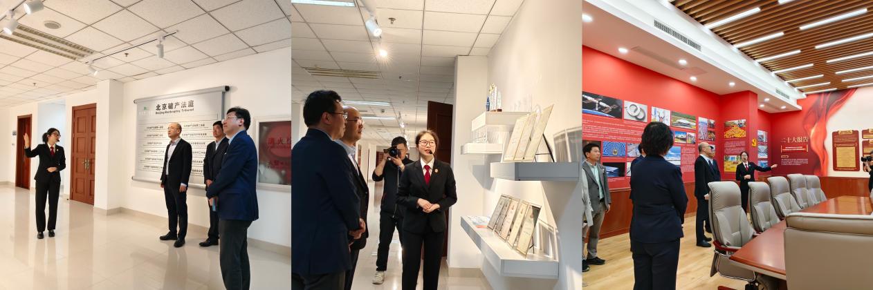 座谈签约前,在北京市第一中级人民法院院长马强、审判委员会专职委员赵悦及相关工作人员的陪同下,梁迎修一行先后参观了北京市破产法庭的立案服务中心、公益律师咨询中心、材料收转中心、司法送达中心、金融服务中心以及自助查询区,详细了解各功能区域的运作流程。在参观过程中,工作人员还介绍了破产法庭的发展历程、工作人员的卓越风采、经典案例的实践成果。此外,一行人还参观了党建活动中心和阅读区,深入感受法庭的文化氛围。