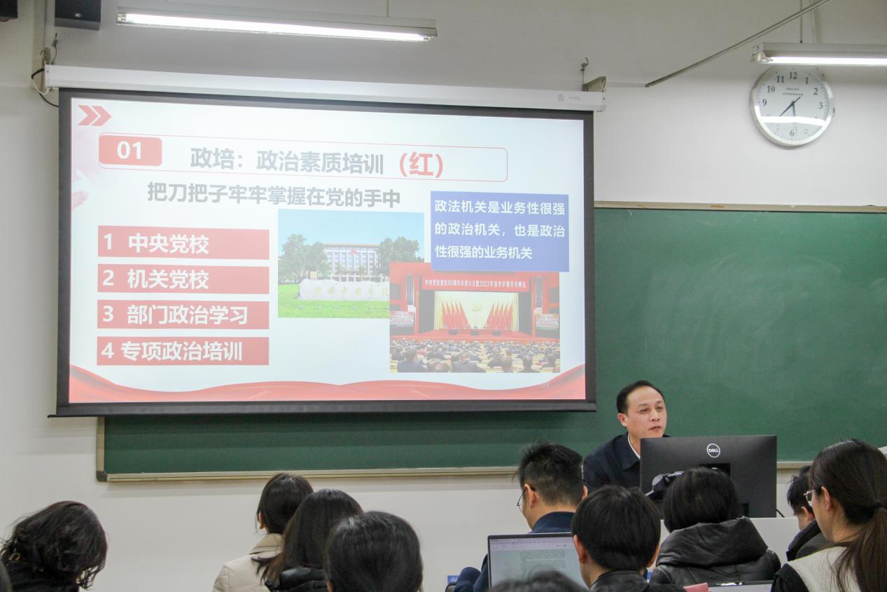 周玉庆副主任说,深入推进司法责任制改革,是党的十八大以来以习近平同志为核心的党中央坚持全面依法治国,顺应现代法治发展需要,更好满足让人民群众在每一个司法案件中感受到公平正义的重大举措,有力地提高了司法质效、促进了司法公正。对于现阶段检察官“如何养”,周主任谈到,司法责任制改革背景下,检察机关用好“红、专、实、尖、外”五字诀,通过政治素质培训“政培”、专业能力培养“专培”、实践能力锻炼“锻培”、精英人才培养“精培”、涉外法治人才培养“外培”等五条路径,持续锻造高素质专业化检察官队伍。对于检察官职业发展“走向哪”,周主任结合检察官入额、检察官等级、职级晋升等有关规定,谈到进入检察院工作,可以入额成为检察官、成长为检察机关领导人员、成为党政机关领导干部、成为检察业务专家、成为涉外检察官、成为检察英雄模范等六条发展路径,为在场师生讲清了检察官的职业发展方向。对于大学生适应职场“怎么办”,周主任结合丰富的工作经历谈到,考试是让组织发现的重要途径,要不断提高自身综合素质,做好准备考;不干,半点马克思主义都没有,要摒弃自我、重利、怕责、躺平的错误倾向,不谈条件干;文字能力是体制内职场的核心竞争力,要不厌其烦写,通过“模仿、模糊、模范、模型”的四个阶段使自身的写作能力得到质的飞跃;要保持良好心态乐,努力成为有胸怀、有情怀、有身怀、能开怀的新时代好青年;廉洁自律是职业发展的前提和基础,要严格自律守住底线,时刻注重通过自我革命完善自身,把理念转化为信念、将情绪转化为情怀、把牢骚转化为“离骚”、将抱怨转化为抱负。